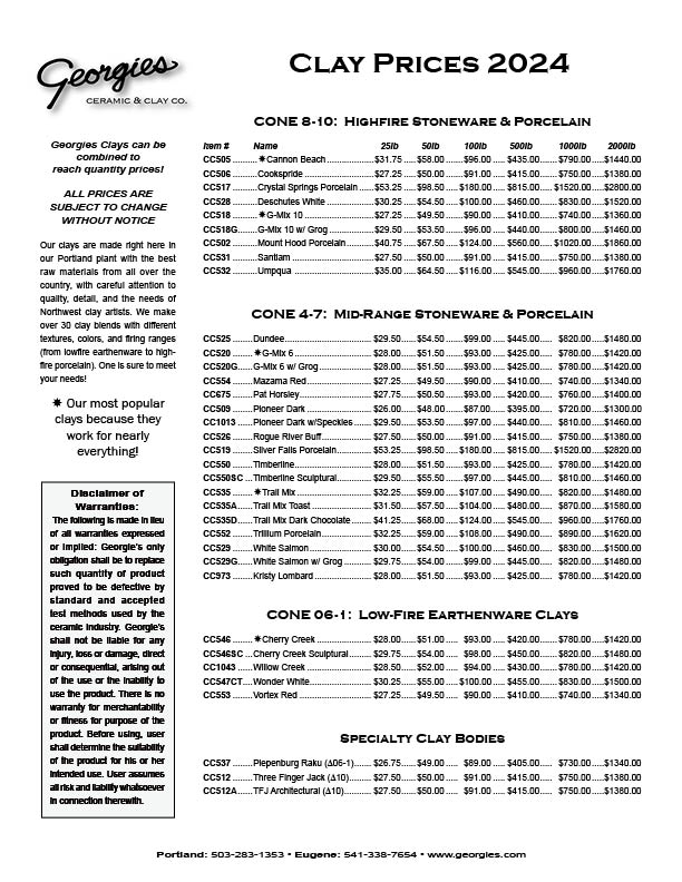 Georgies Lowfire Clays (Cone 06-1) Georgies clays can be combined to reach quantity discounts More Clays: Midrange • Highfire • Dry • Paper • Slip Lowfire clays, also called earthenware clays, are rarely taken to higher temperatures than cone 04 (about 1940° F). These sample pictures show the clay colors after oxidation firing in an electric kiln. They're easy to work with, easy to fire, and offer the widest range of glaze color possibilities for decoration. To make your ware food safe - Lowfire clays must be glazed with food safe glazes and the glazes fired to their proper maturity.