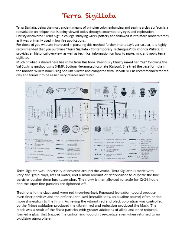 Terra Sigillata, being the most ancient means of bringing color, enhancing and sealing a clay surface, is a remarkable technique. It is made with very fine grained clays, lots of water, and a small amount of deflocculant to disperse the fine particles. The slurry must settle for 12-24 hours and the super fine particles are then siphoned off. This is a low-production item. Please contact us for stock on hand.
