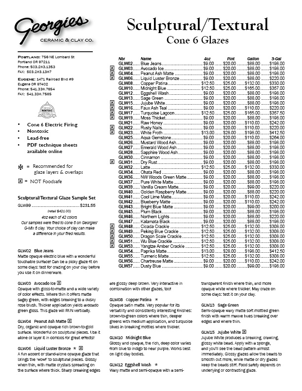 All these glazes are nontoxic. However, not all are food-safe because some have dry or breaking surfaces after firing. We recommend bisque firing to cone 04, glaze firing to cone 6 at medium speed, and kiln ventilation for all firings.
