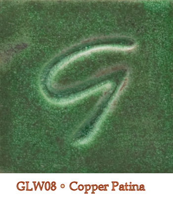 Matte and opaque. This is a kissing cousin to Copper Patina, but producing a bright aqua blue that mottles to black. Food-safe.