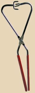 For dipping bisque ceramic pieces into glaze containers. Four sharp grip points give these tongs a minimal footprint on the piece. Made from plated steel, the tongs have dipped plastic handles for better grip in your hand. About 12" long.