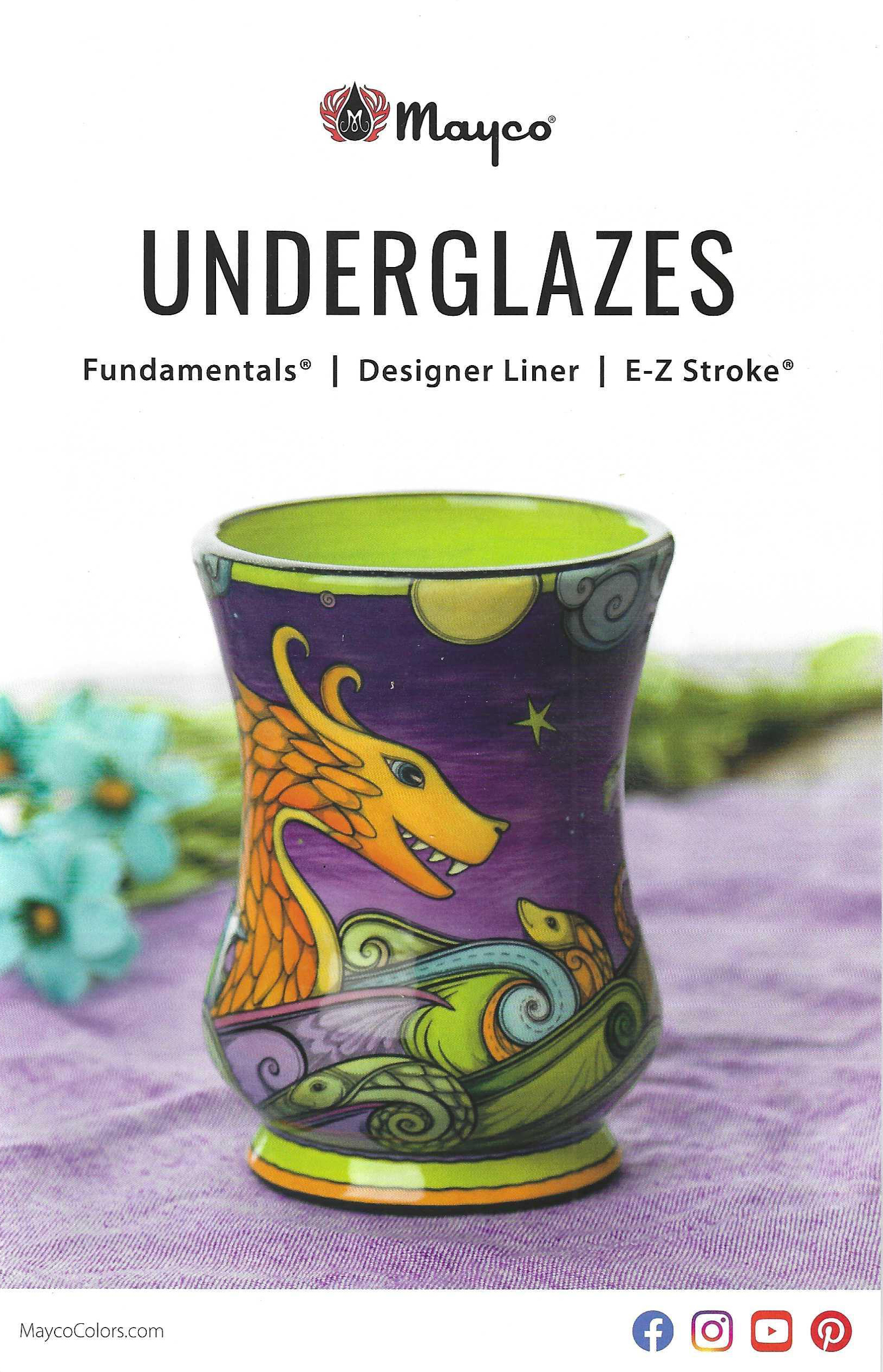 Mayco Fundamentals Underglazes may be applied to wet clay, greenware, or cone 04 bisque; use for design or solid coverage, firing range from cone 06 to cone 10. To intensify the color or for use on dinnerware, apply clear or matte clear glaze.
