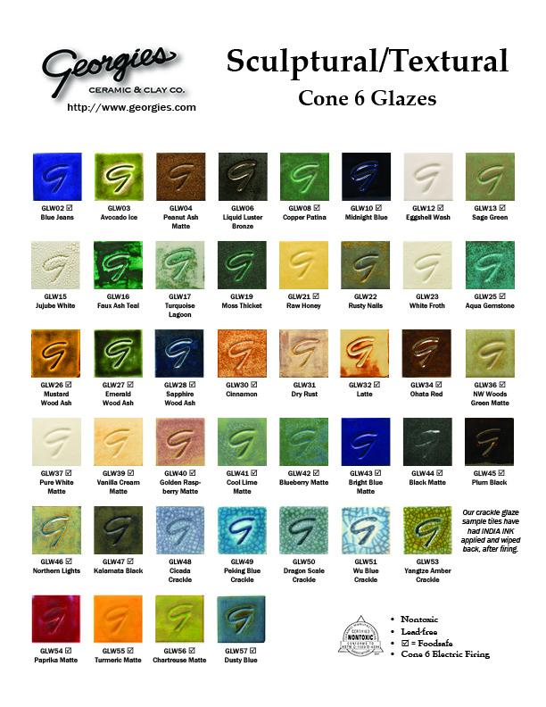 All these glazes are nontoxic. However, not all are food-safe because some have dry or breaking surfaces after firing. We recommend bisque firing to cone 04, glaze firing to cone 6 at medium speed, and kiln ventilation for all firings.
