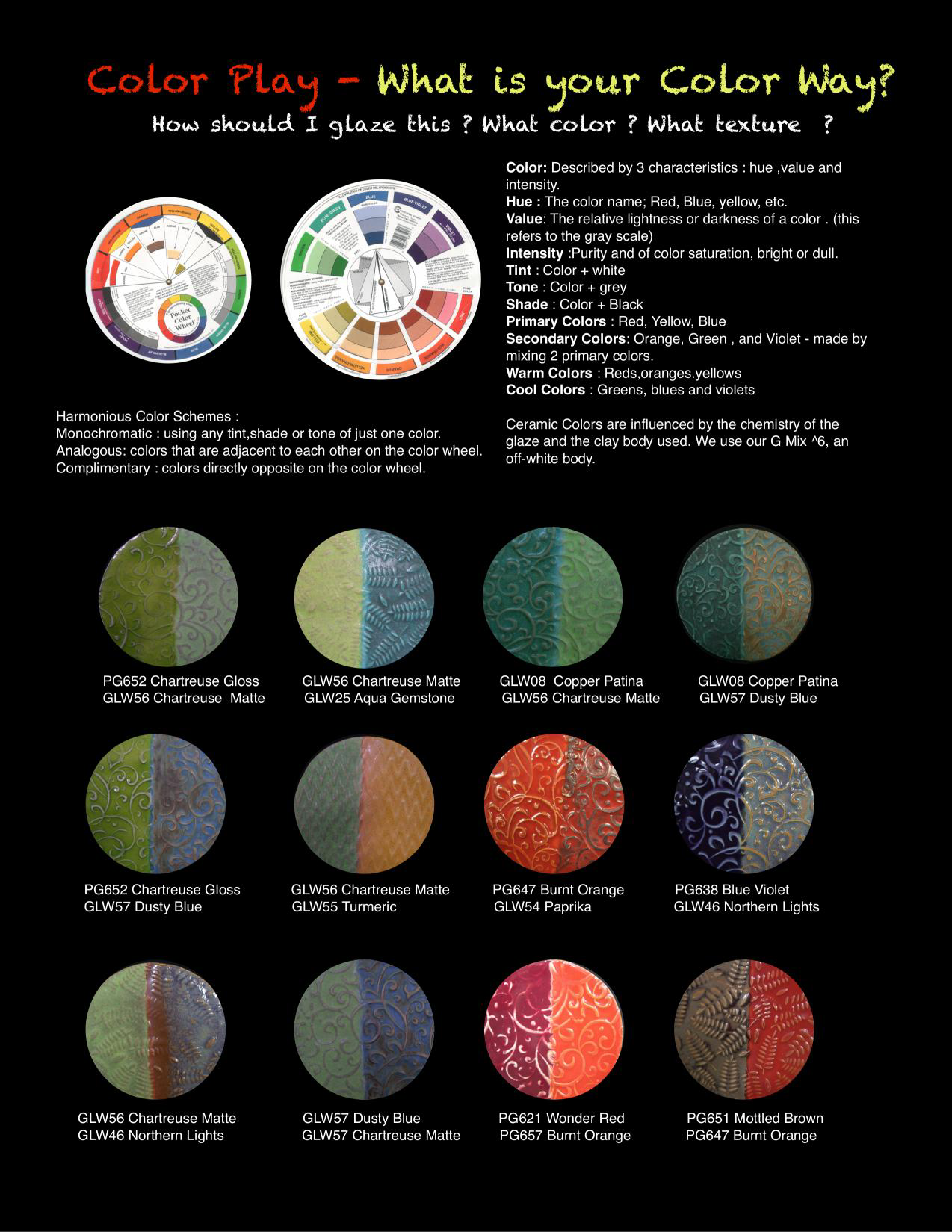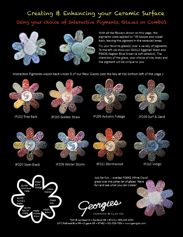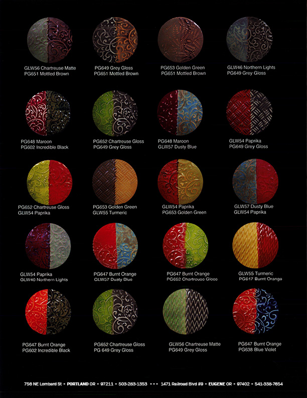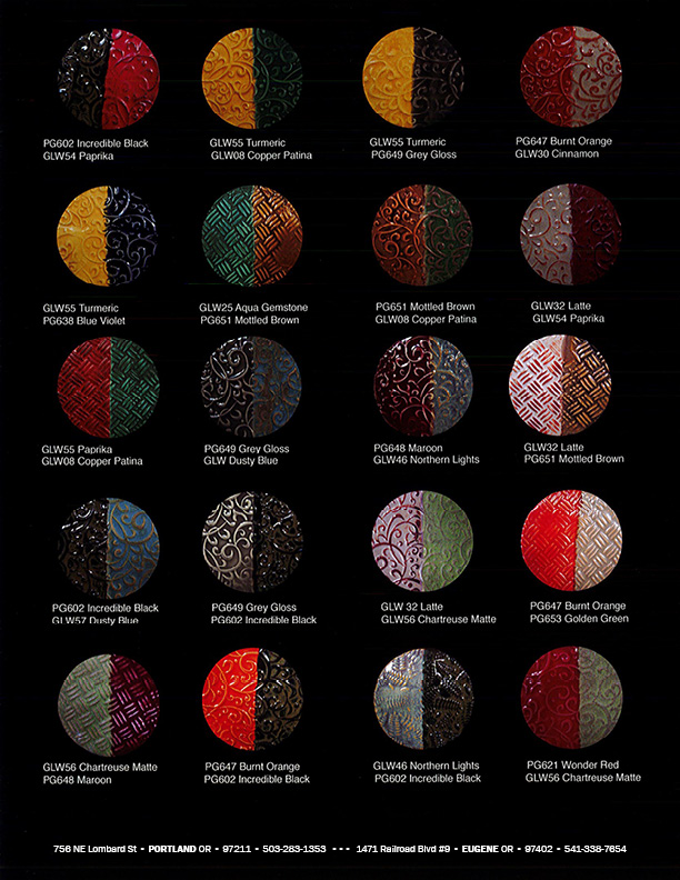 As we continue developing our website, we will add photos of the most successful, interesting and dramatic color combinations. Download our glaze brochure, available at the bottom of this page, for a few suggested combinations.